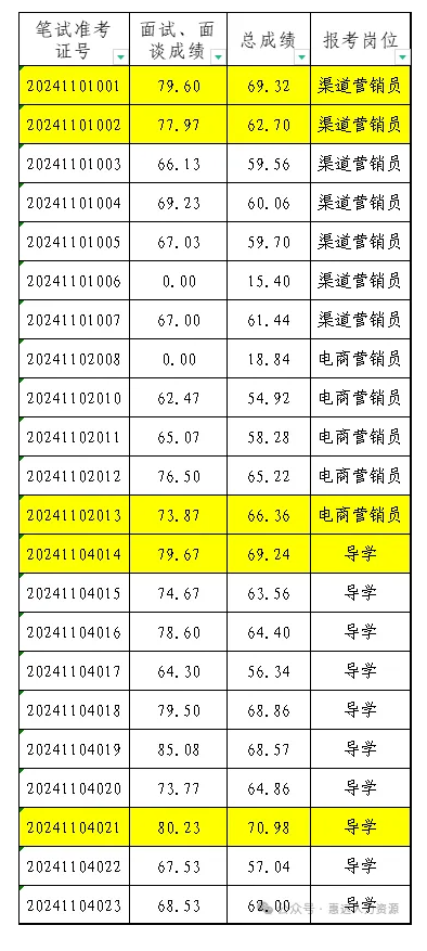 以下表格中标黄人员为拟定进入考察、体检程序人员,公示期满后,请根据电话通知按时参加后续流程,未按规定时间和地点参加考察、体检的,按自愿放弃处理。