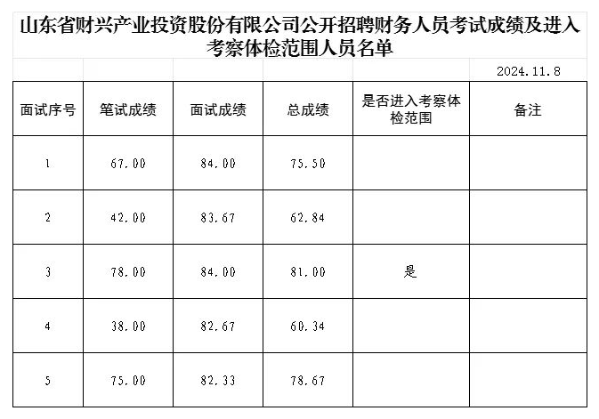原文标题:山东省财兴产业投资股份有限公司公开招聘财务人员考试成绩及进入考察体检范围人员名单