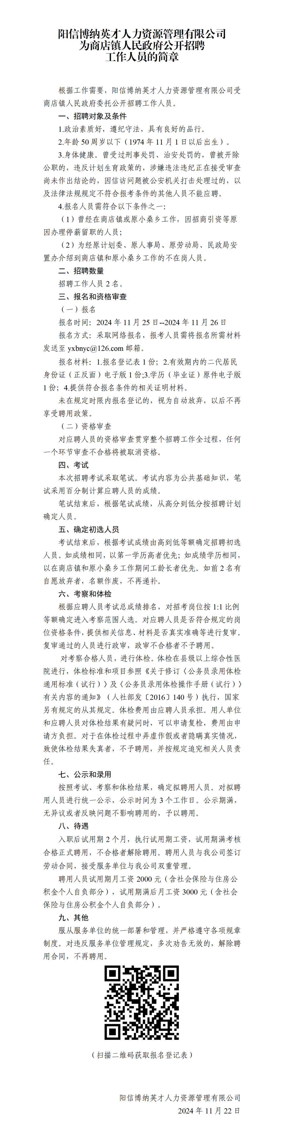 2024滨州阳信博纳英才人力资源管理有限公司为商店镇人民政府公开招聘工作人员的简章(2人)