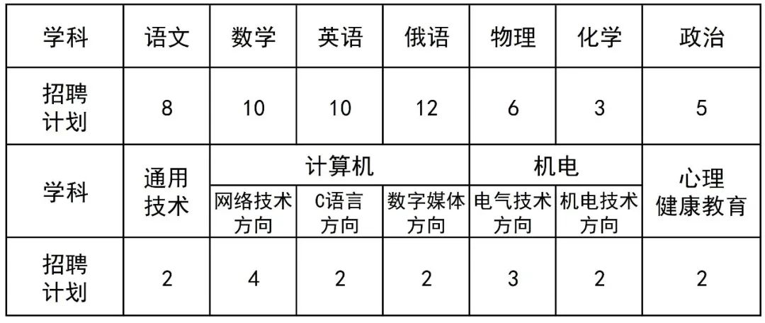 5.应聘人员应具备与应聘学科相符的高级中学教师资格证。(其中,报考计算机和机电学科的具备相应中职教师资格证亦可;具有职教高考教育工作经验、英语四级及以上者优先考虑);