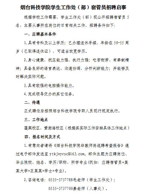 原始标题:烟台科技学院学生工作处(部)宿管员招聘启事