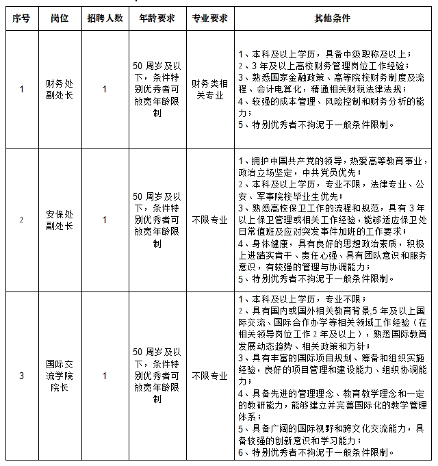 为大力实施“人才强校”战略,深化干部人事制度改革,建设高素质干部队伍。根据学校发展实际需求,我校面向社会公开招聘3名中层管理干部,现将有关事项公告如下: