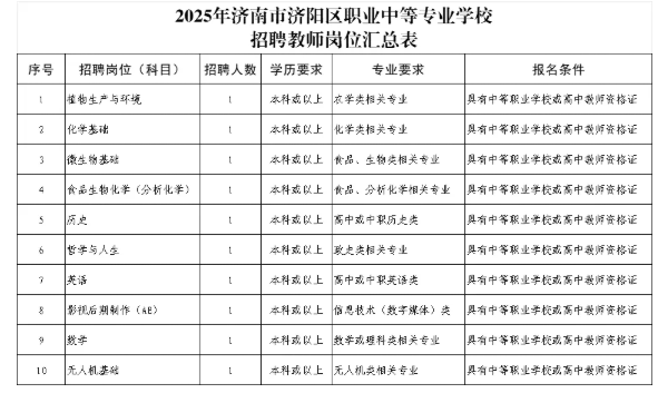 2.招聘岗位、招聘计划、学历要求、教师资格要求等条件,见附件《2025年济南市济阳区职业中等专业学校招聘教师岗位汇总表》。